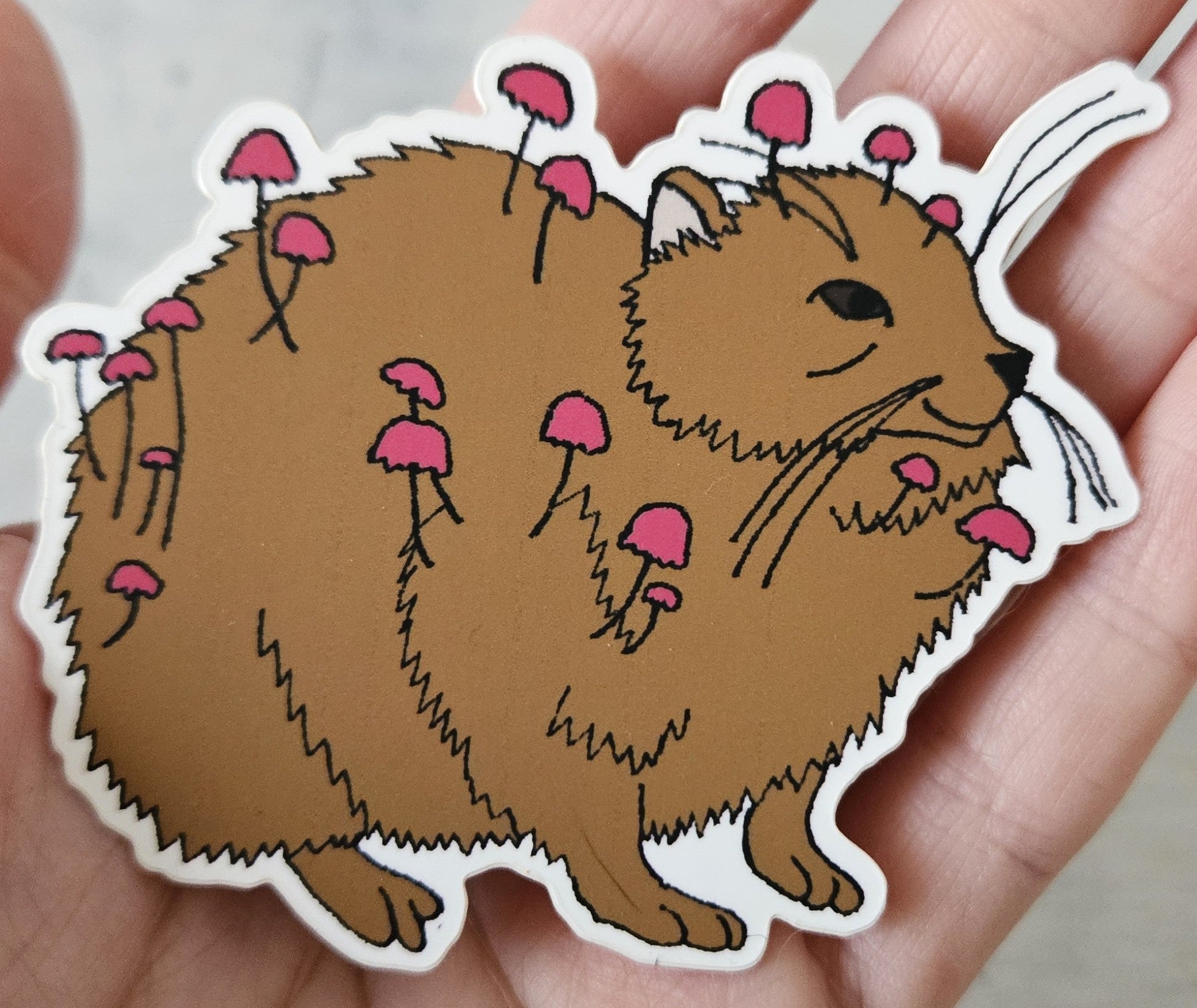 These stickers feature my illustration of a rock hyrax with purple pinwheel mushrooms from my 2025 Funguary series. They have been professionally printed on white vinyl.