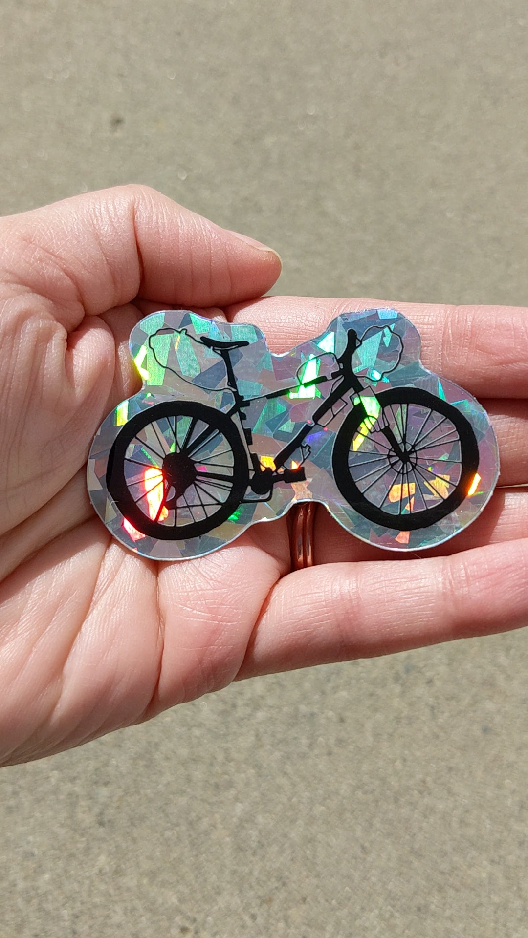 These stickers feature my original drawing of a loaded bikepacking bike. They have been professionally printed onto prism holographic vinyl.