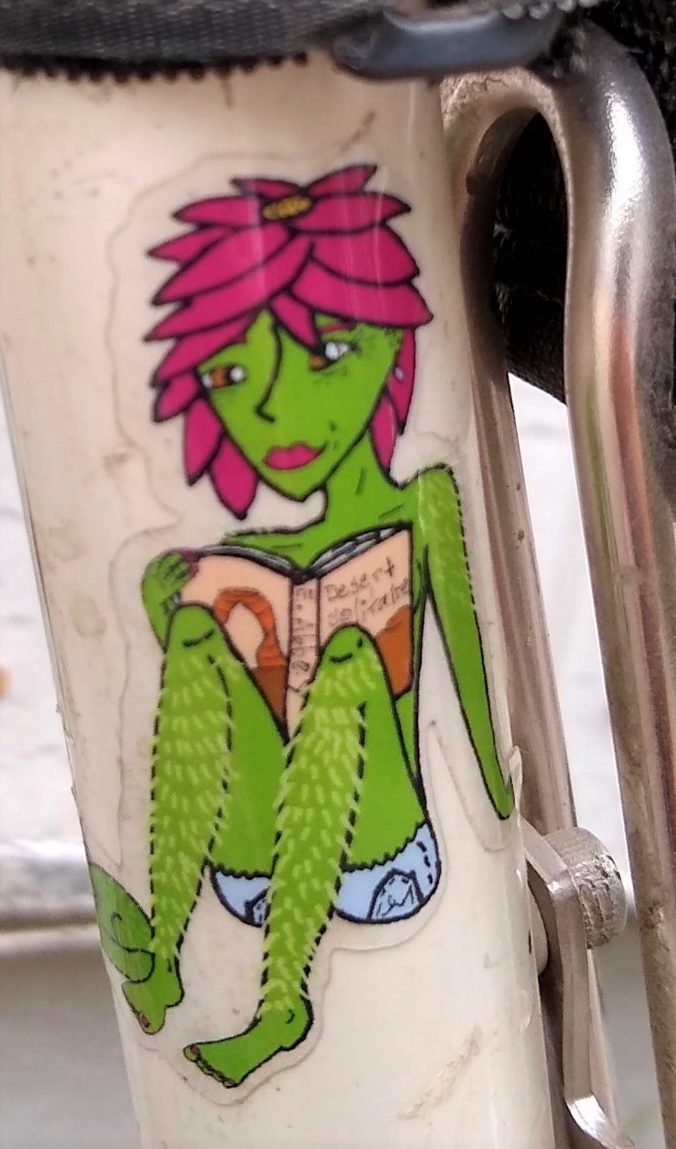 These stickers feature my full color "Cactus Queen" illustrations, Choose from a cactus woman reading the book Desert Solitaire sitting next to her catcus (cactus cat) or a 1950s inspired cactus woman with a suitcase. They have been professionally printed on clear vinyl. Third photo shows one of the stickers on my bike to give an idea of how the clear border looks. Printed area of the sticker is fully opaque.