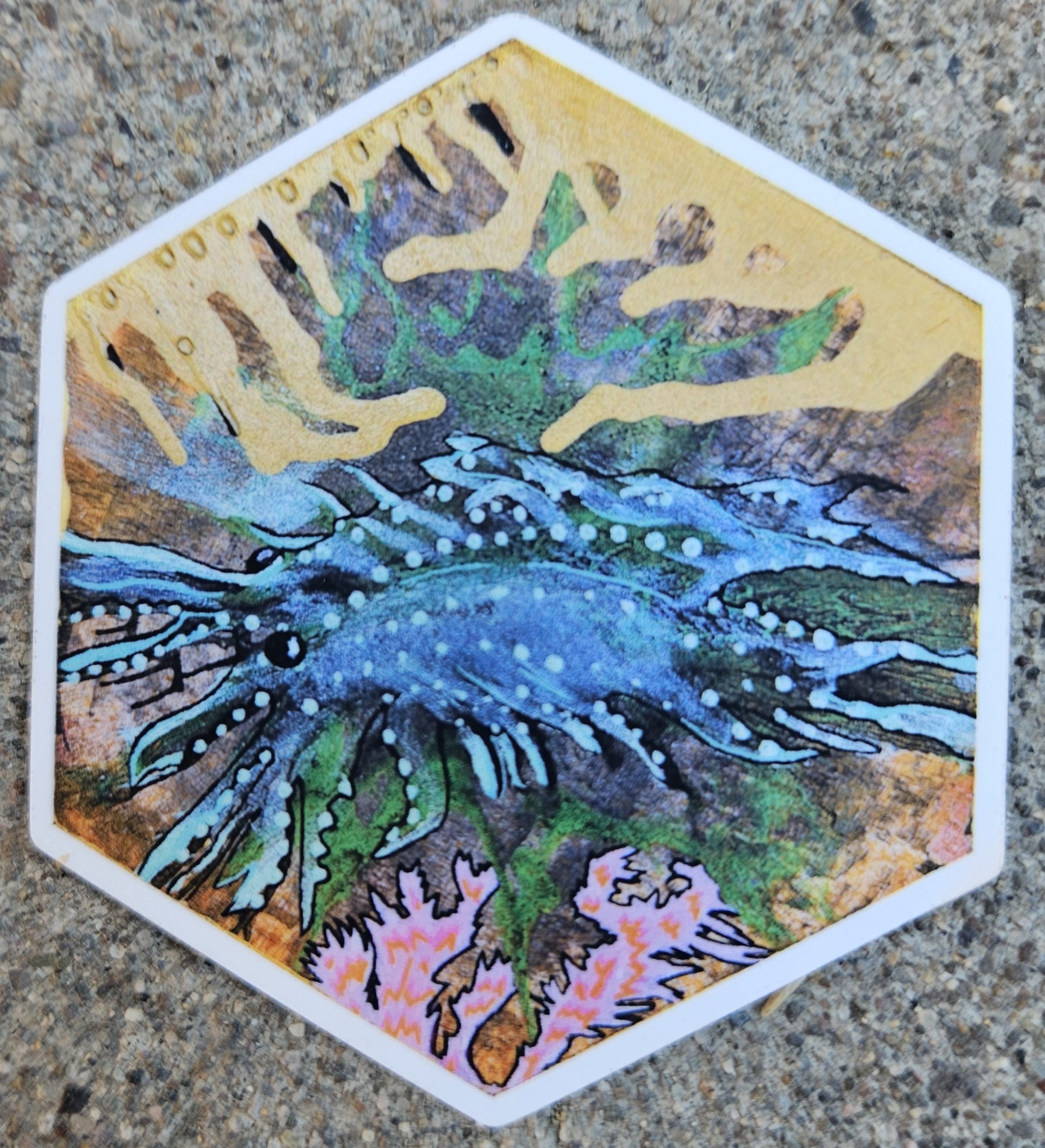 These stickers feature the painting "Cambrian Creature" I did in collaboration with Johnny Simon as part of the Honeycomb Project traveling exhibit. They have been professionally printed on white vinyl.