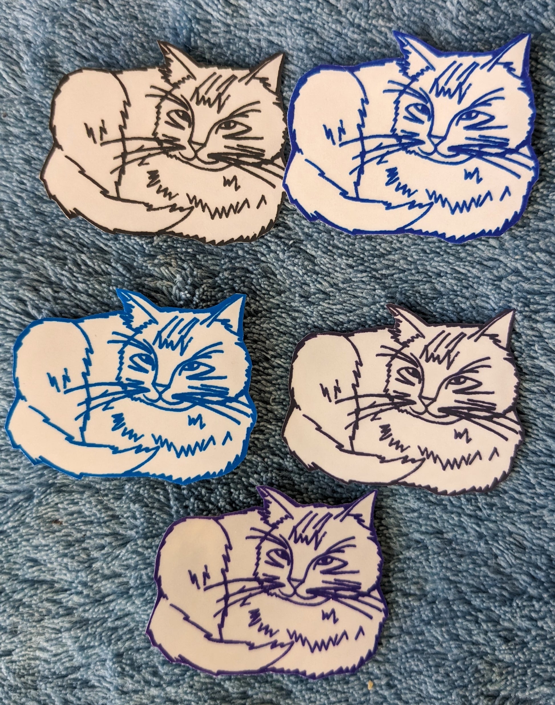 These stickers feature a drawing of my cat curled up into a loaf position. They have been screen printed by hand onto high quality vinyl in a variety of colorways. When selecting "blue" you may receive one of two vinyl colors, "grey" has three different potential vinyl colors and "clear" stickers may come with any ink color. The exact variant you receive will be randomly selected, but if you want a particular color send me a message and I will do my best to accommodate you. Each sticker has been trimmed by hand with a small border. These stickers are limited batch and will never be available again.