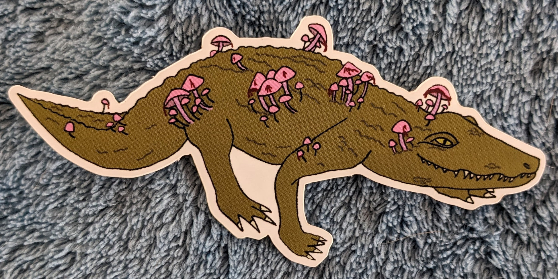 These stickers feature my illustration of a Nile crocodile with bleeding fairy helmet mushrooms from my 2023 Funguary series. They have been professionally printed on white vinyl.