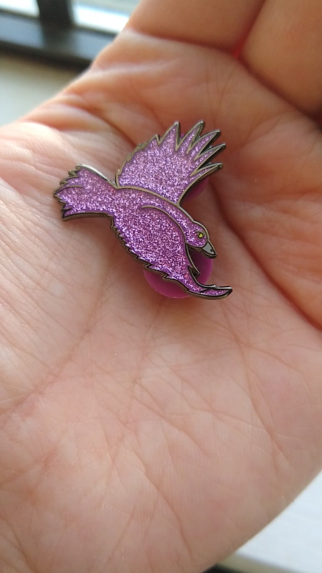 These hard enamel pins feature my character Disco Nails from my "Golden Hour Ritual" drawing. Disco is filled with sparkling purple glitter. The pins are black plated nickel with two posts and official Zeppy Stardust Studios back stamp. Each pin comes with purple rubber clutches on a backing card.
