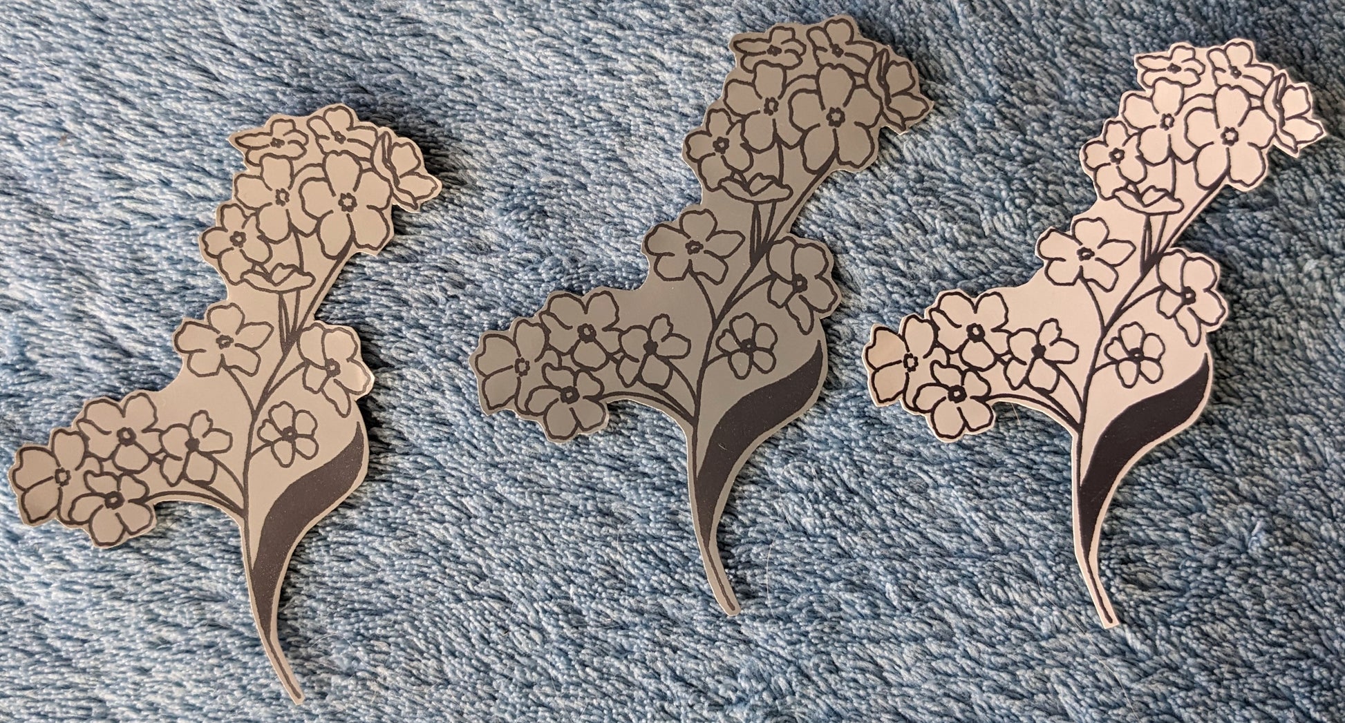 These stickers feature a drawing of a sprig of forget me nots . They have been screen printed by hand onto high quality vinyl in a variety of colorways. When selecting "blue" you may receive one of two vinyl colors, "grey" has three different potential vinyl colors and "clear" stickers may come with any ink color. The exact variant you receive will be randomly selected, but if you want a particular color send me a message and I will do my best to accommodate you. Each sticker has been trimmed by hand with a small border. These stickers are limited batch and will never be available again.