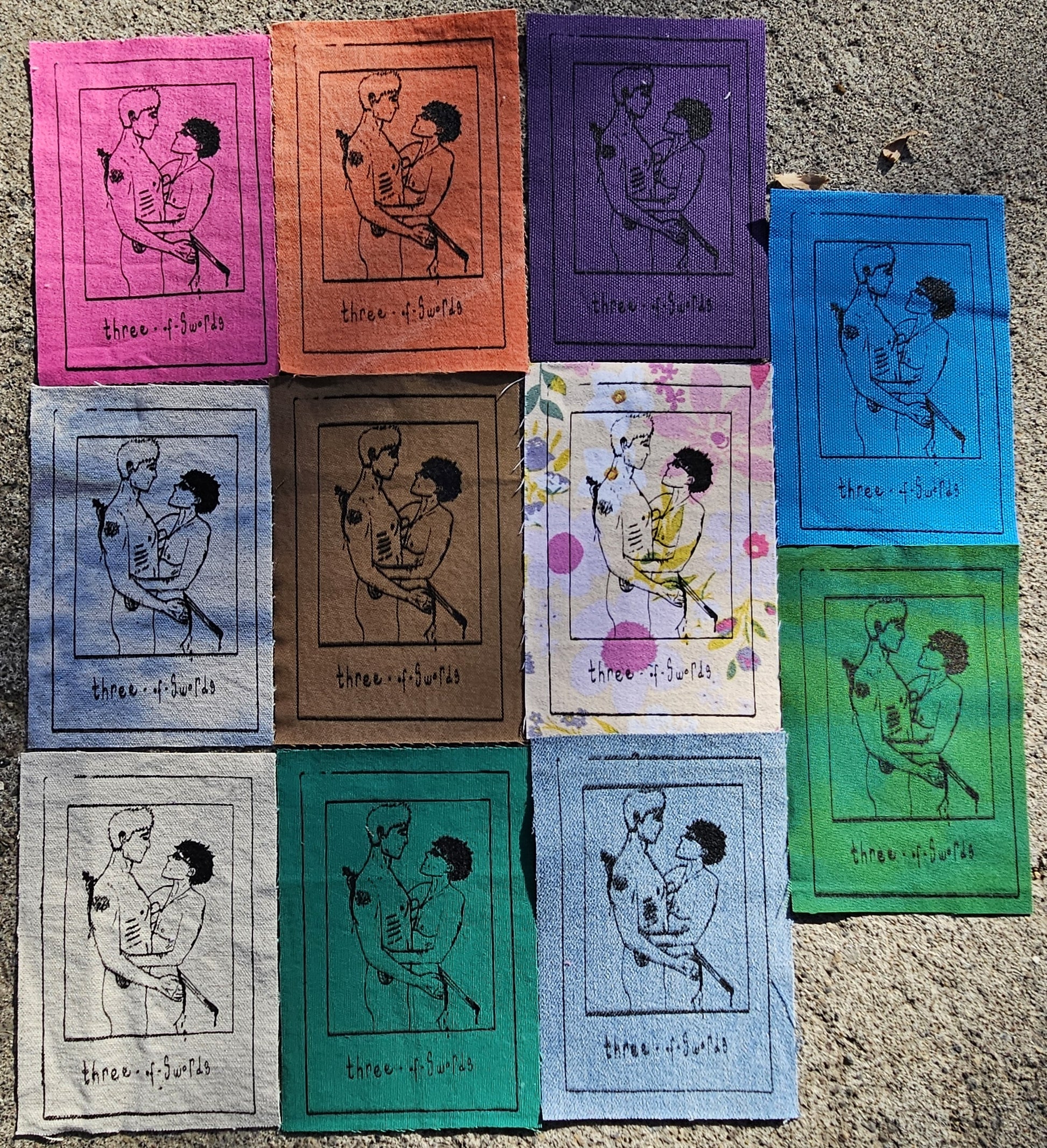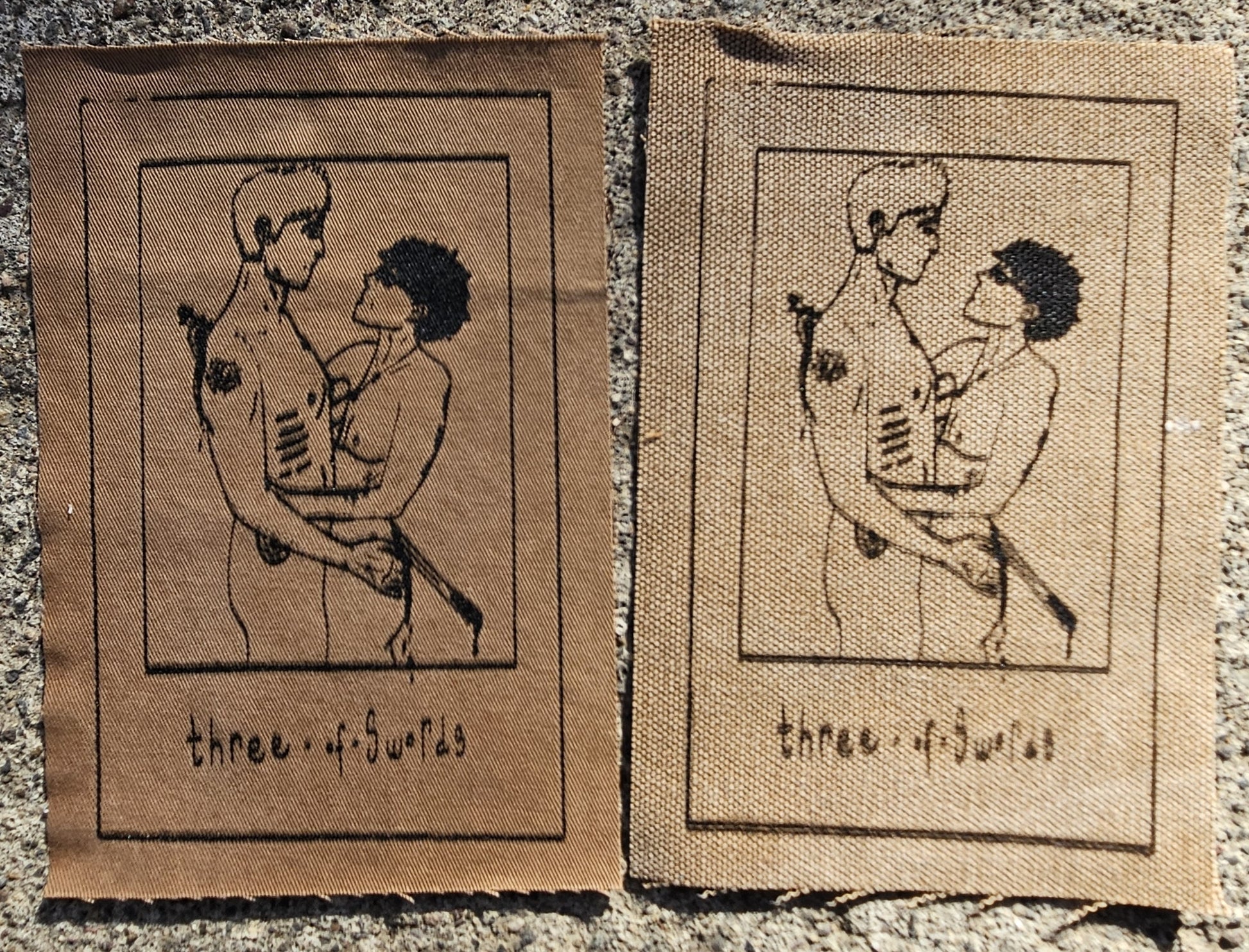 These patches feature my Three of Swords illustration. They have been screen printed by hand with eco-friendly, high quality black ink onto 100% cotton denim.