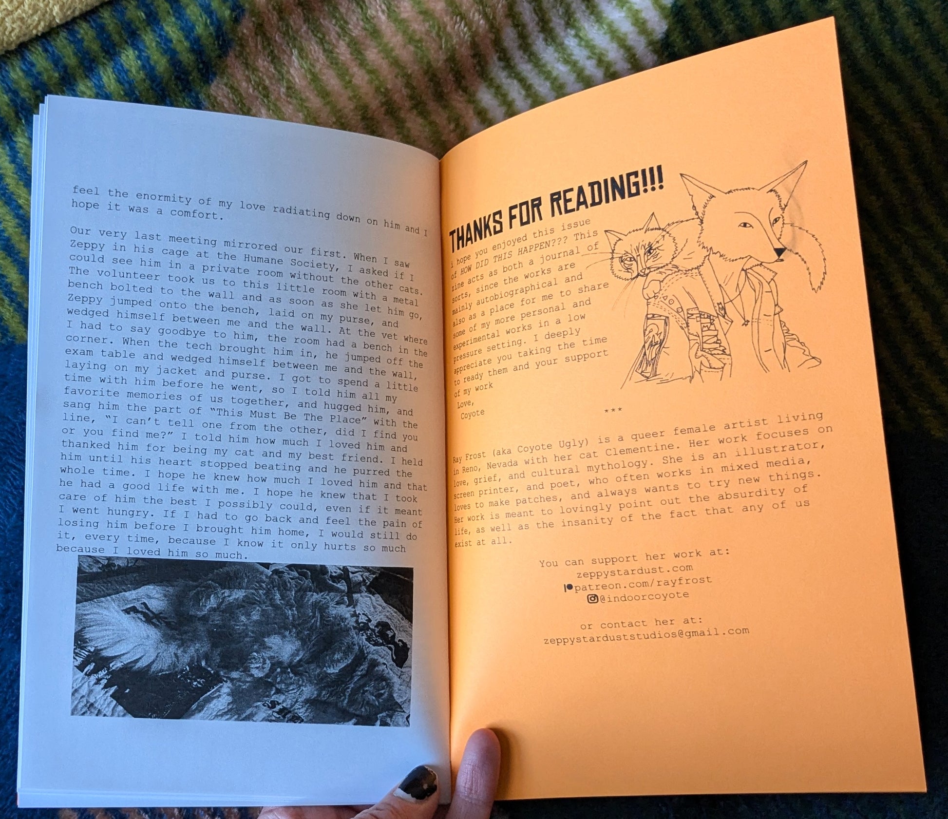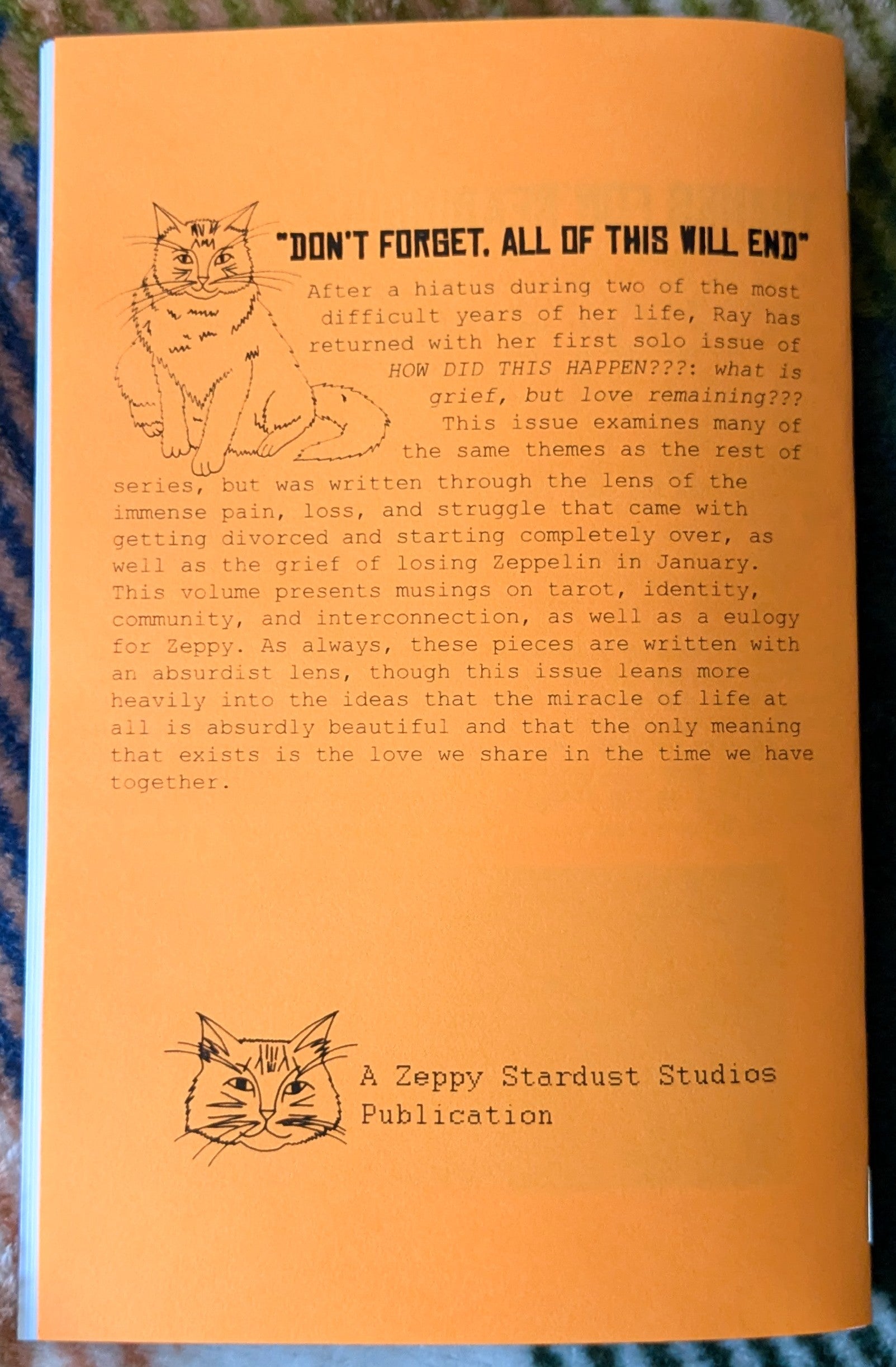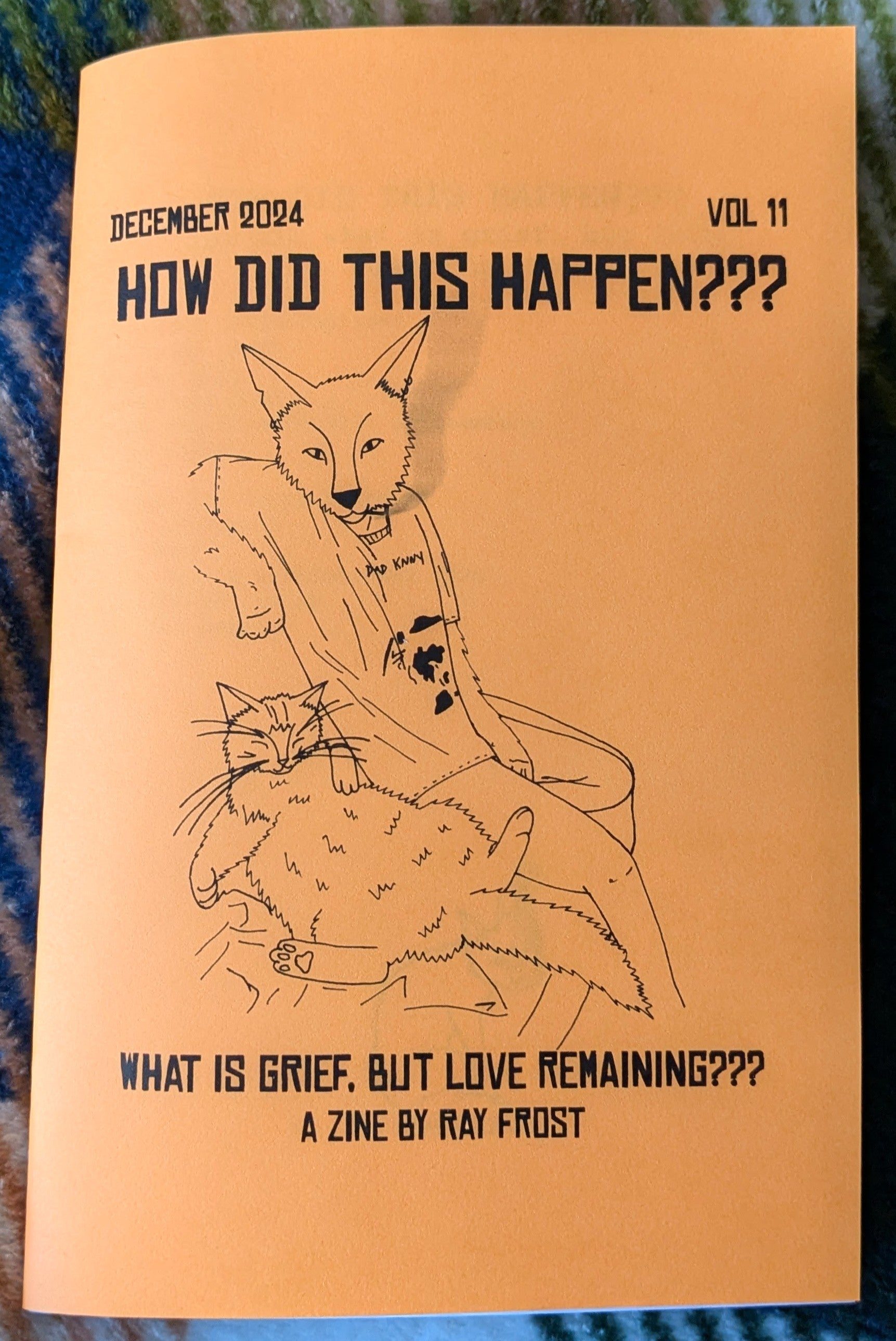 Vol. 11: what is grief but love remaining??? (December 2024): 20 pages presenting musings from the past two years of Ray's life and a eulogy for her cat Zeppy Stardust in her first solo issue in the series