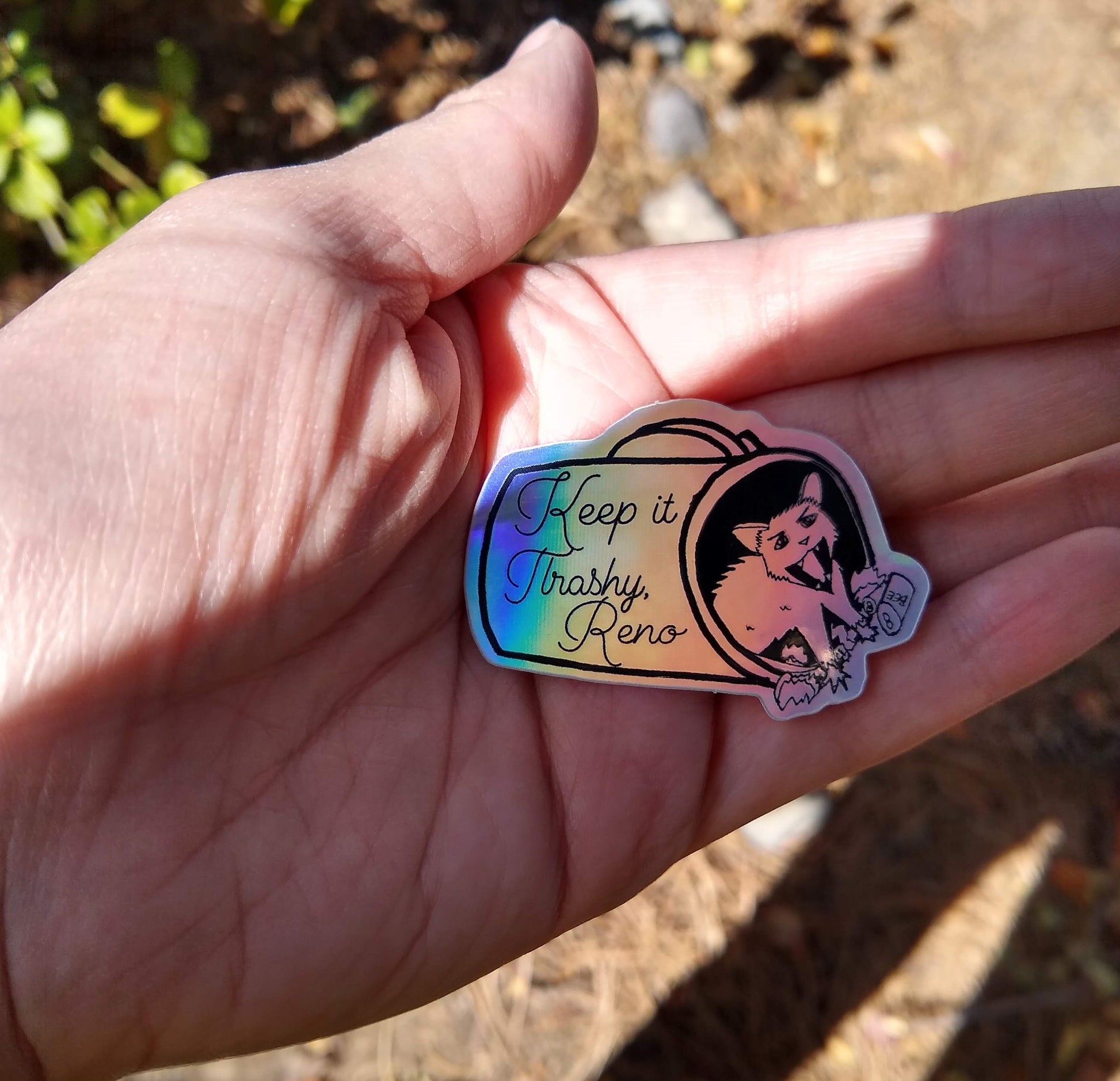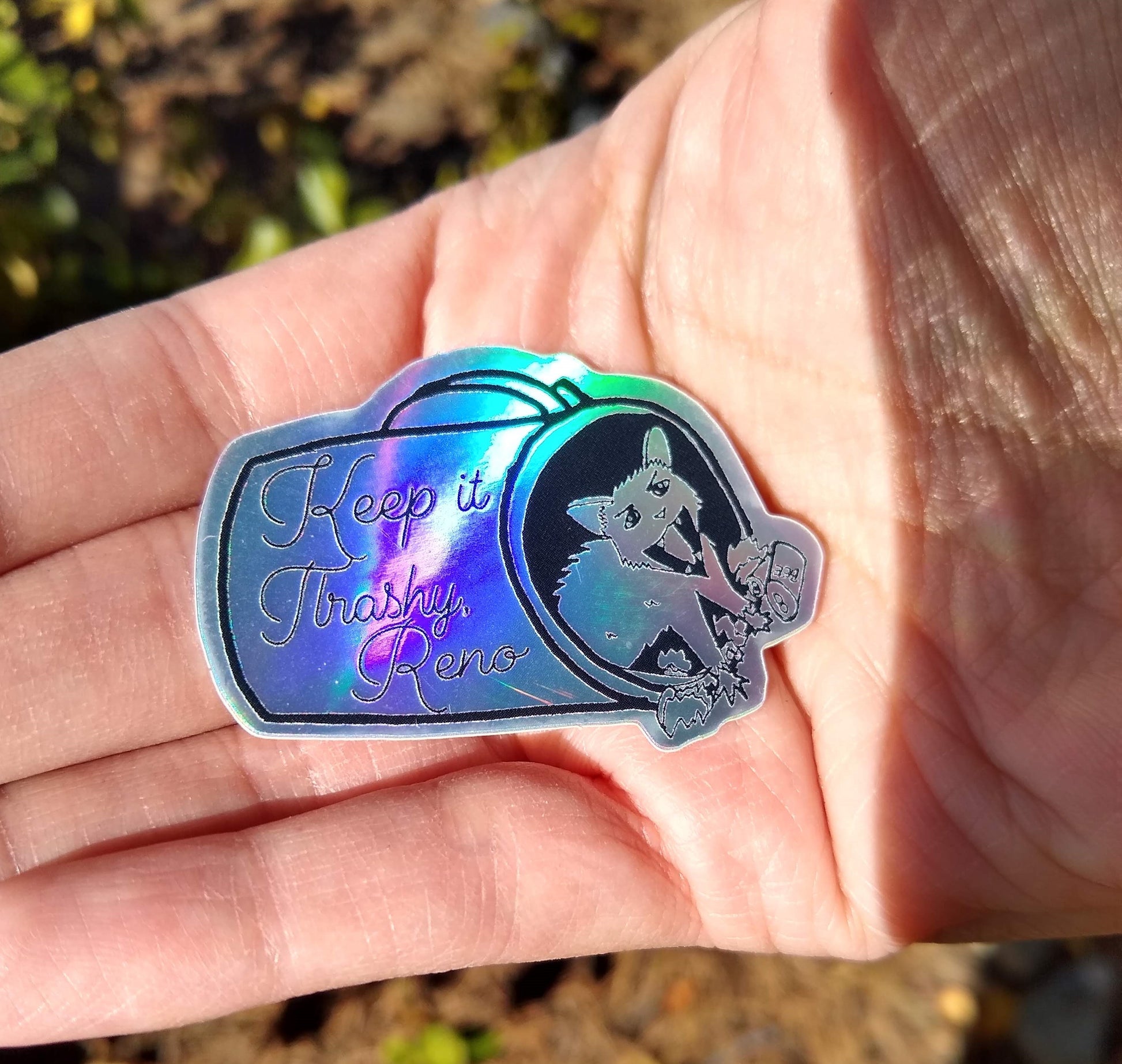 These stickers feature an image of a screaming possum inside of a tipped garbage can, which reads "Keep it Trashy, Reno." They have been professionally printed onto silver holographic vinyl. Show off your pride for my trashy home city!