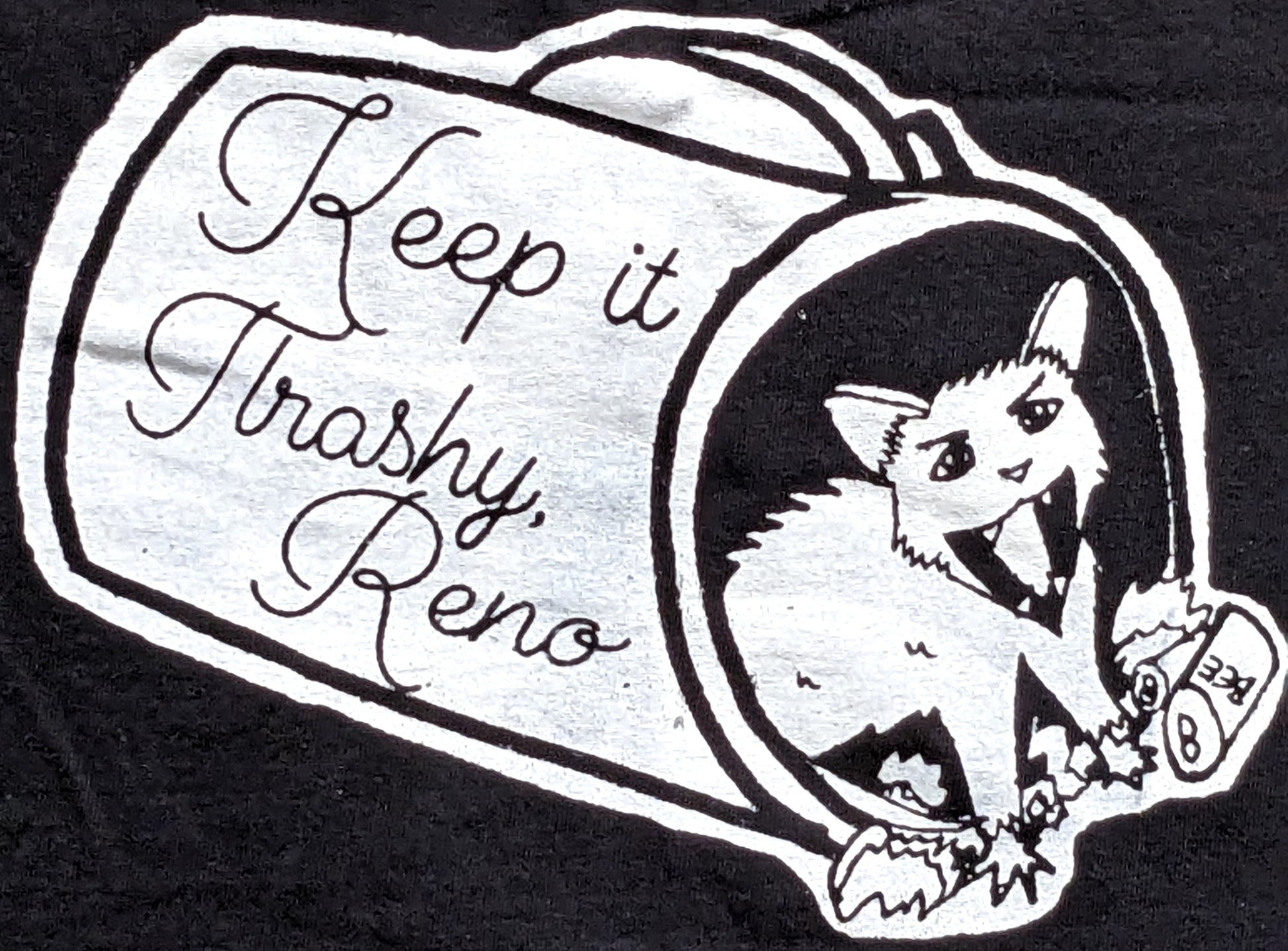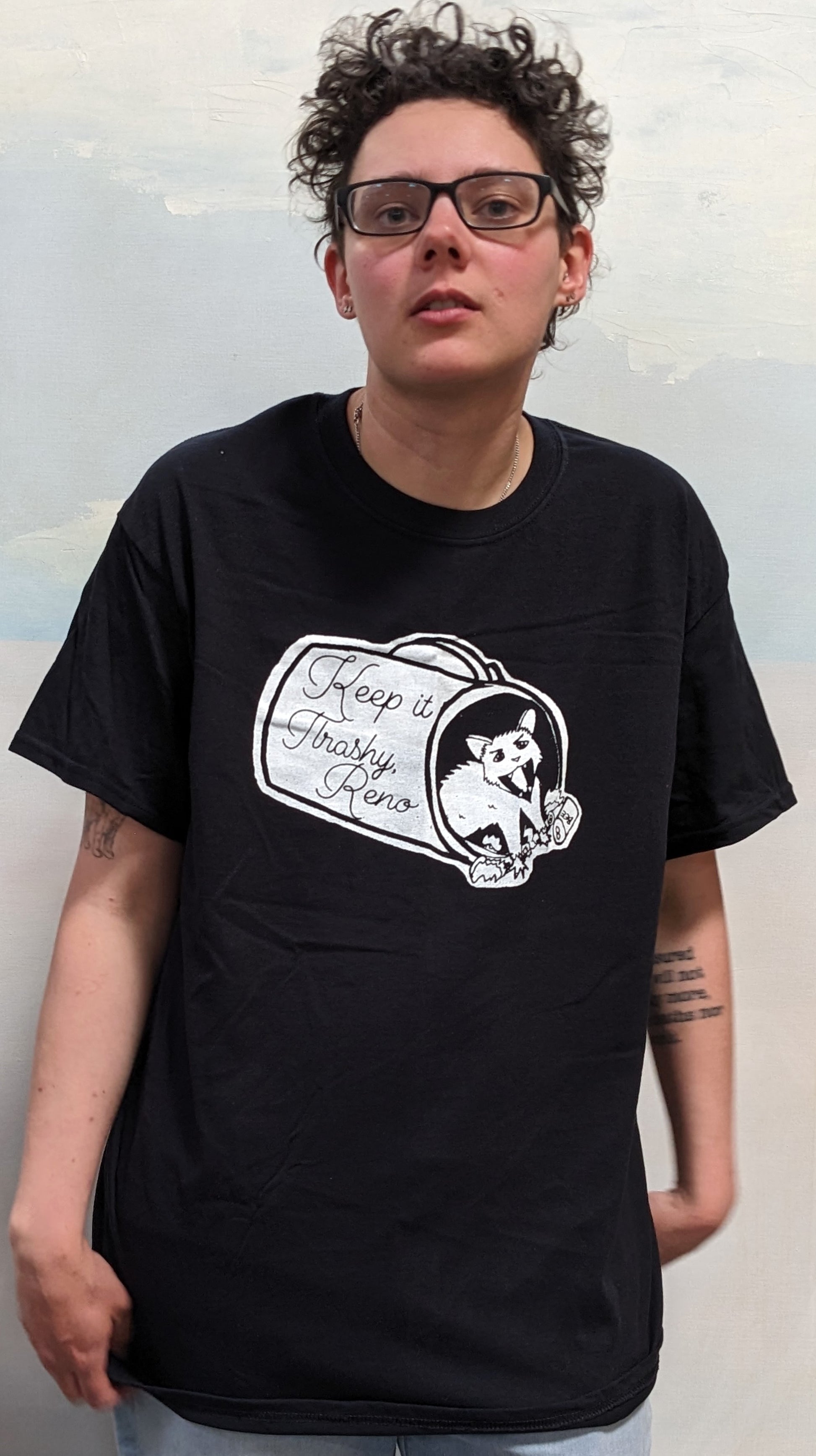 These t-shirts feature an image of a screaming possum inside of a tipped garbage can, which reads "Keep it Trashy, Reno." They have been screen printed by hand with eco-friendly, high quality white ink onto 100% cotton black t-shirts, available in unisex adult size XL, 2X, and 3X.