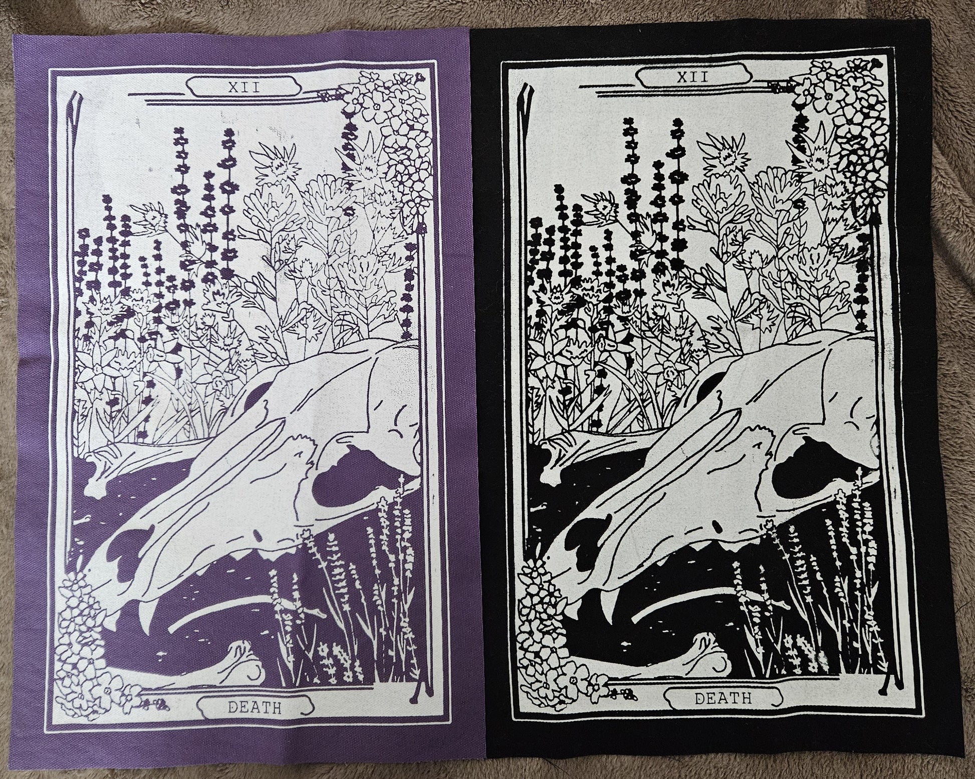 These patches feature a print of Death card from my deck, the High Desert Tarot. They have been screen printed by hand in white eco-friendly ink onto 100% cotton denim or canvas.