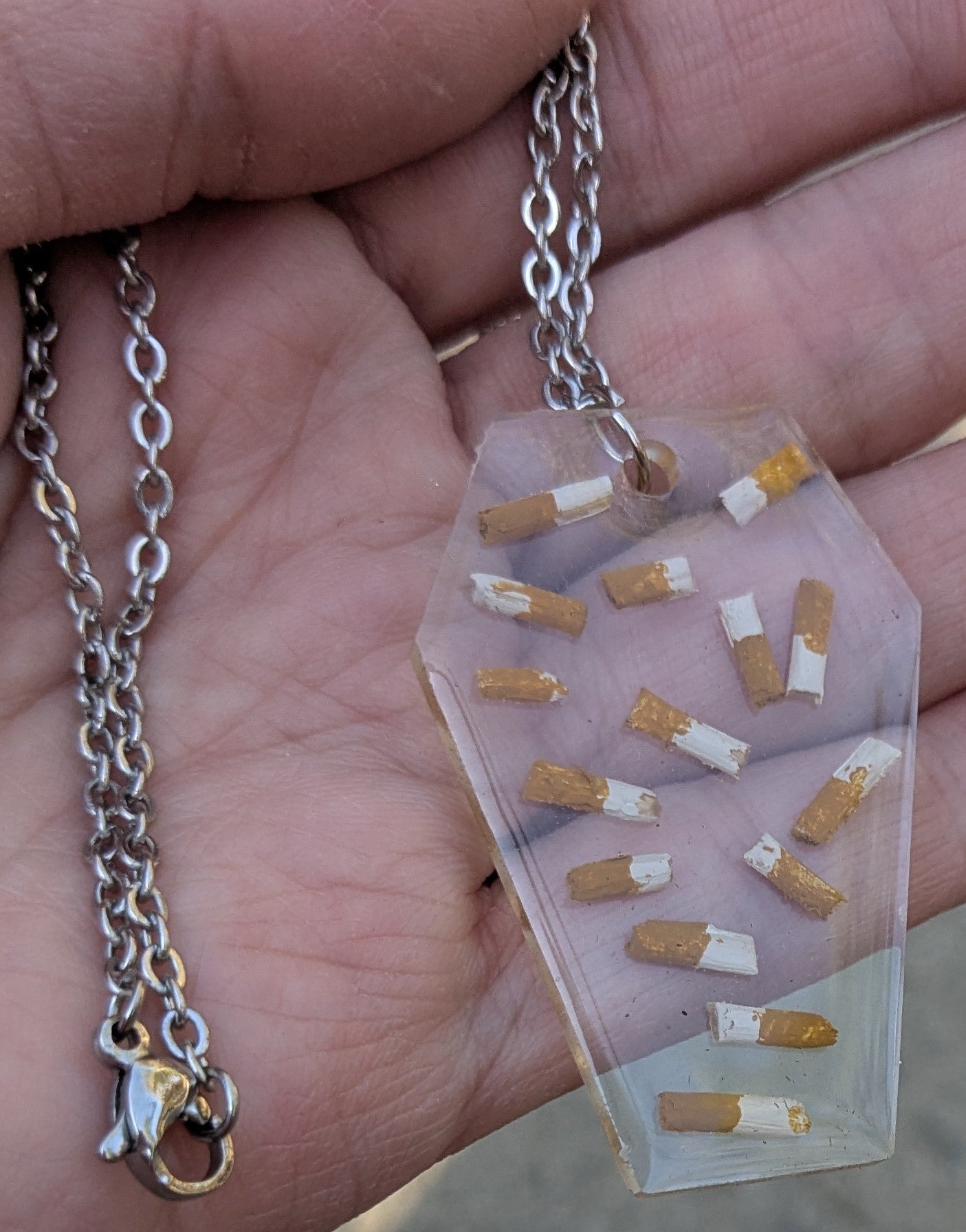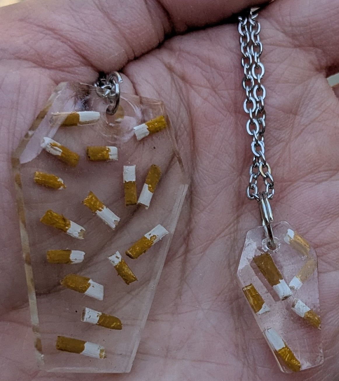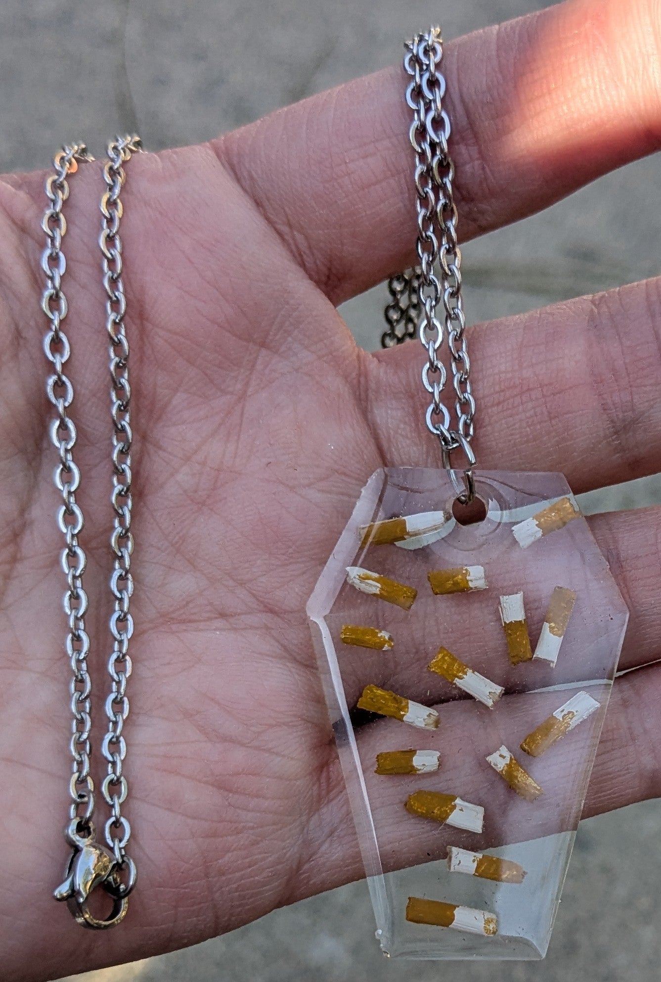 These resin coffin shaped pendants are filled with hand painted wooden cigarettes to look like miniature panels from Nailed as part of our fundraiser. Each pendant comes on a 20 in hypoallergenic stainless steel chain. Small charms measure 1/2 in by 1 in. Large charm measures 1 1/8 in by 1 3/4 in.