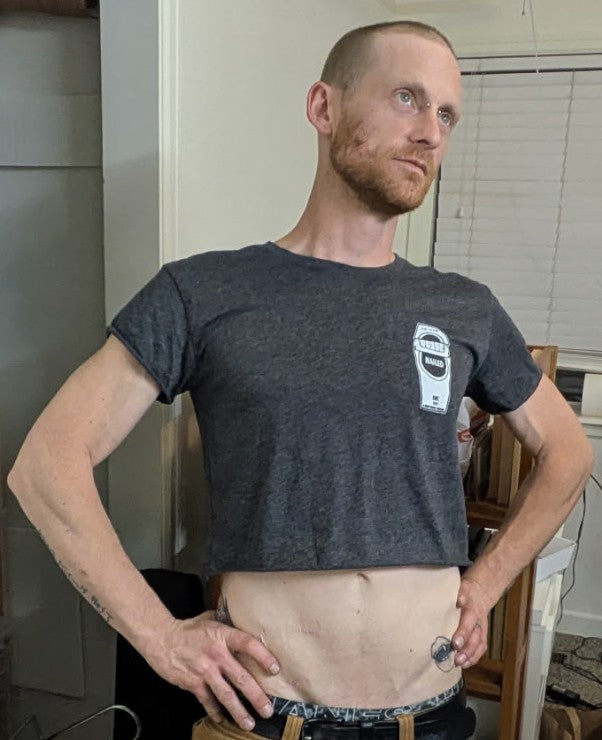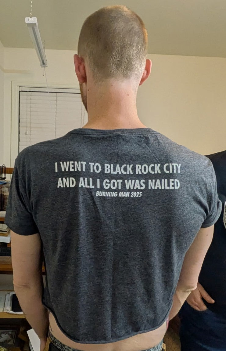 These crop tops feature the coffin cigarette box as a left chest print and text on the back reading "I went to Black Rock City and all I got was Nailed" on the back. They have been screen printed by hand with eco-friendly, high quality white ink onto 60/40 cotton/poly crop tops, available in women's size XS, small, medium, large, XL and 2X.