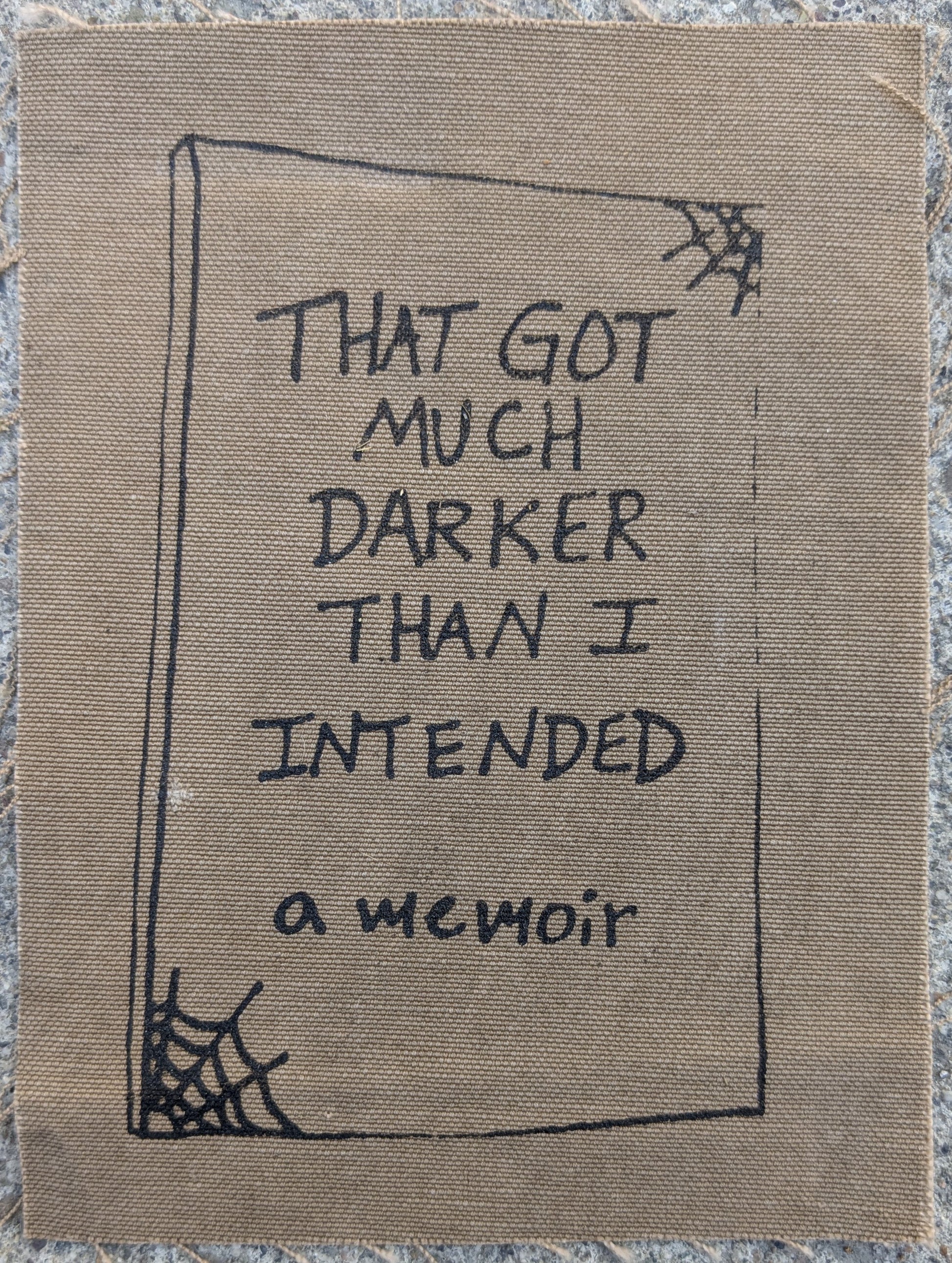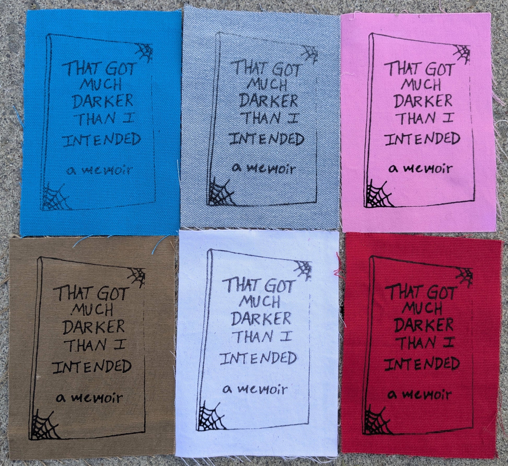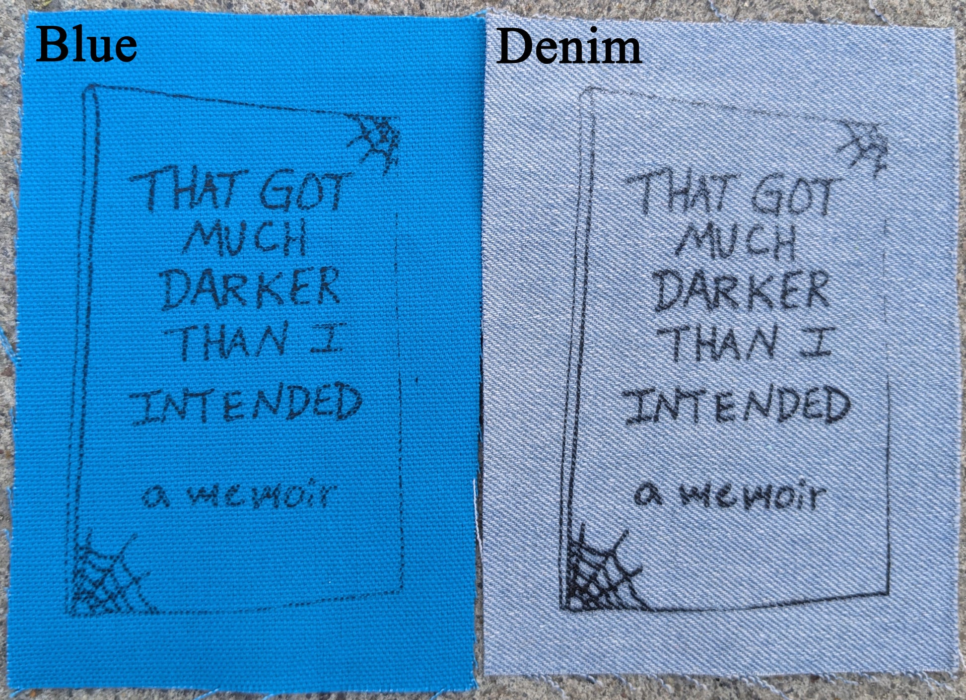 These are small punk patches which feature a hand drawn image of a book which reads "That Got Much Darker Than I Intended: a memoir" with spider webs on the corners. They have been screen printed by hand with eco-friendly, high quality black ink onto 100% cotton denim.
