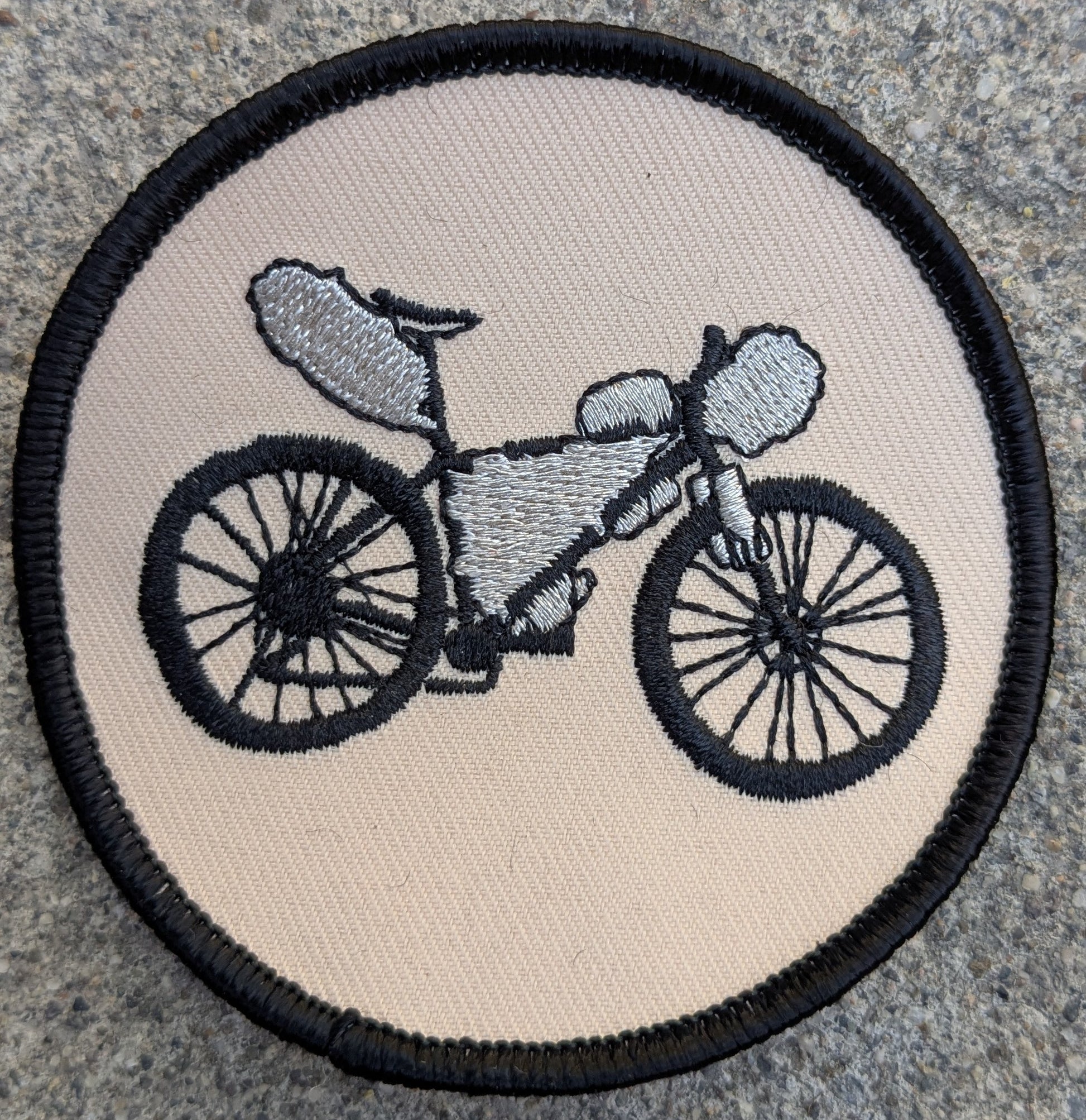 These merit badge style patches feature my drawing of a loaded bikepacking bike. Patches are machine embroidered on cotton twill and have been professionally made from my original hand drawn image. The bags have been embroidered with metallic silver thread. The patches measure 3 inches across.