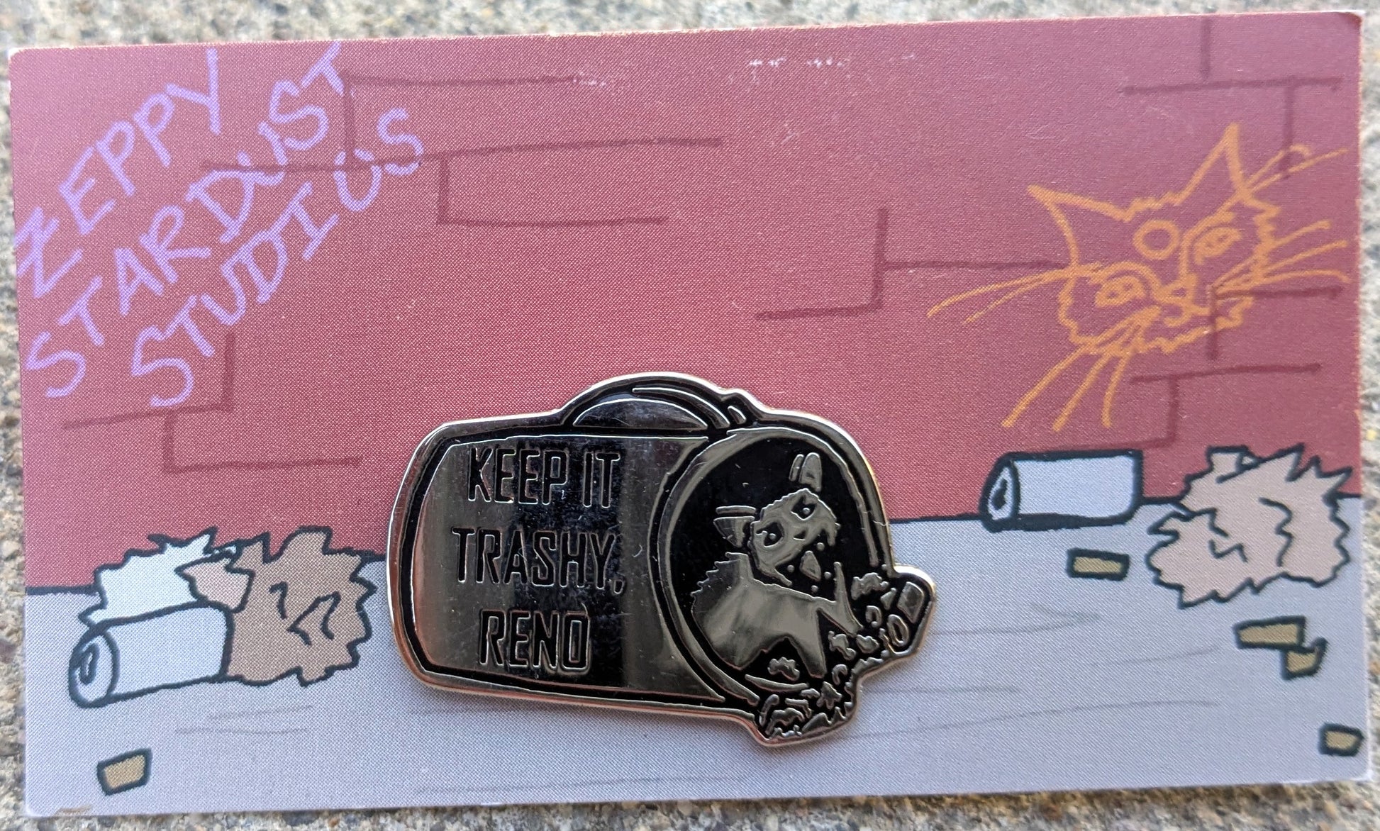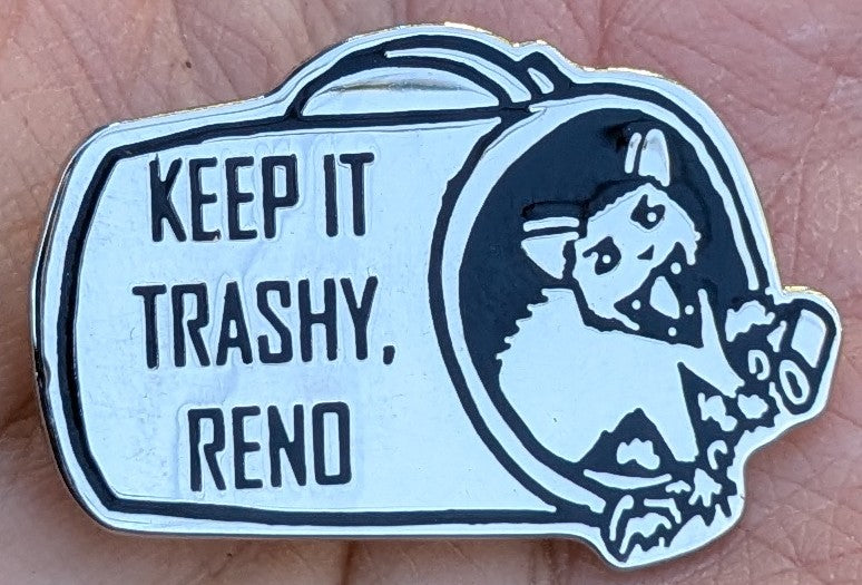 These hard enamel pins feature an image of a screaming possum inside of a tipped garbage can, which reads "Keep it Trashy, Reno." The pins are polished silver steel with two posts and official Zeppy Stardust Studios back stamp. Each pin comes with black rubber clutches on a backing card. Show off your pride for my trashy home city!