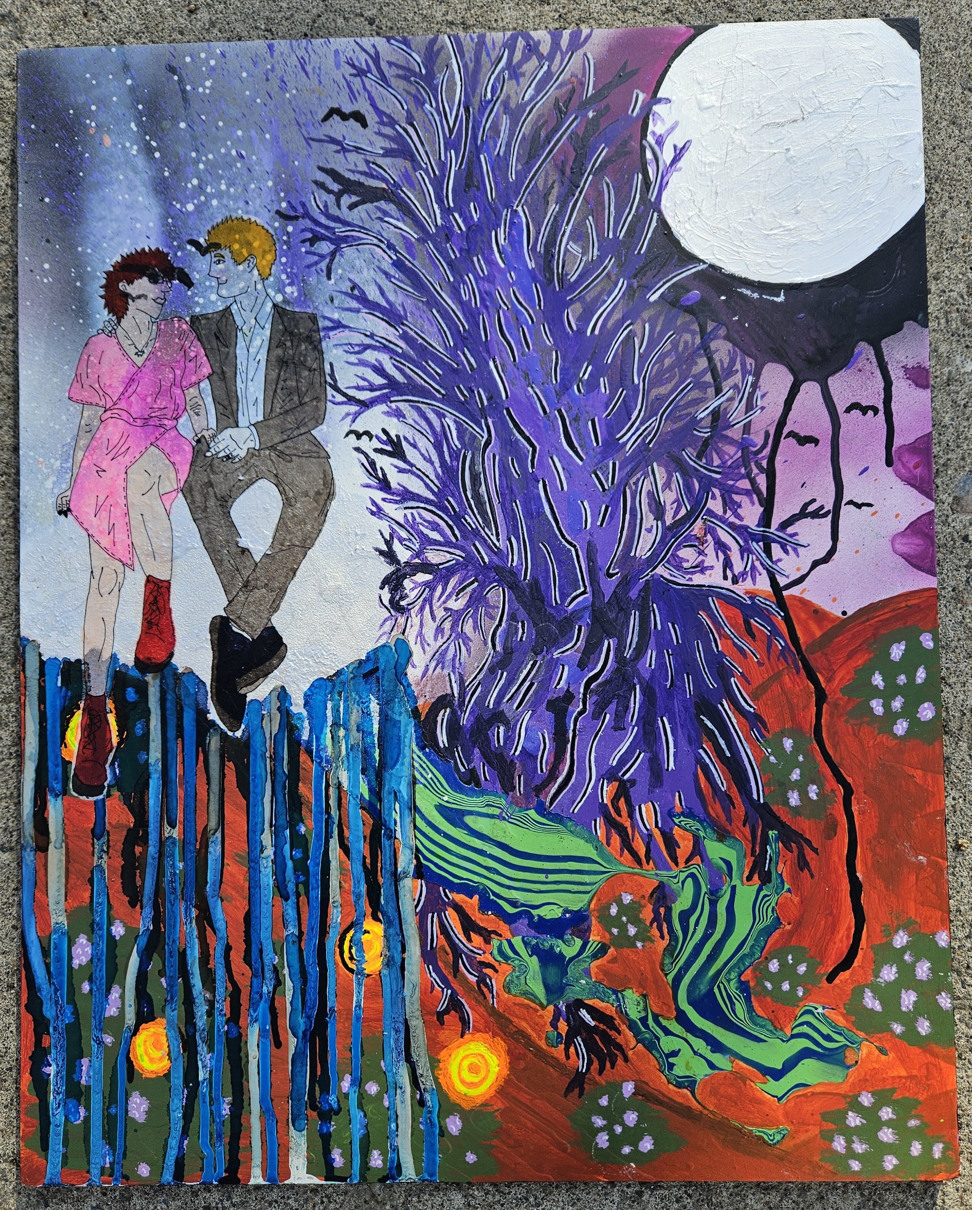 This is an original mixed media artwork on a board, titled "sometimes when a coyote and a cowboy love each other very much, they make a painting" I did in collaboration with Johnny Simon. It features glow in the dark and blacklight reactive details. Comes wired and ready to hang. Created fall 2025. Signed and dated.