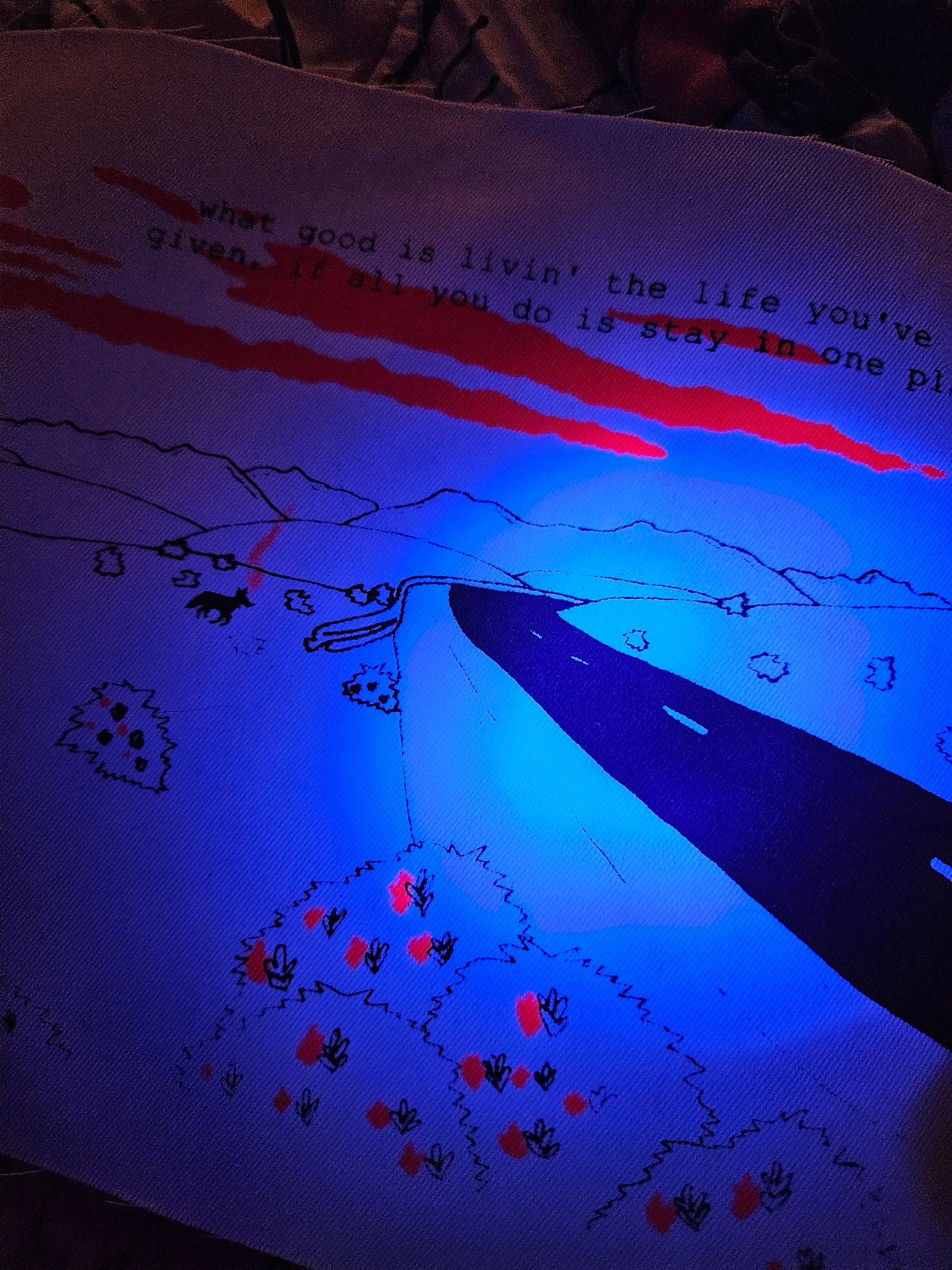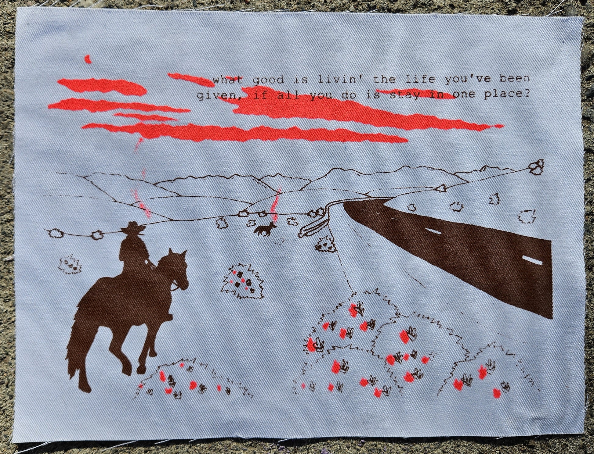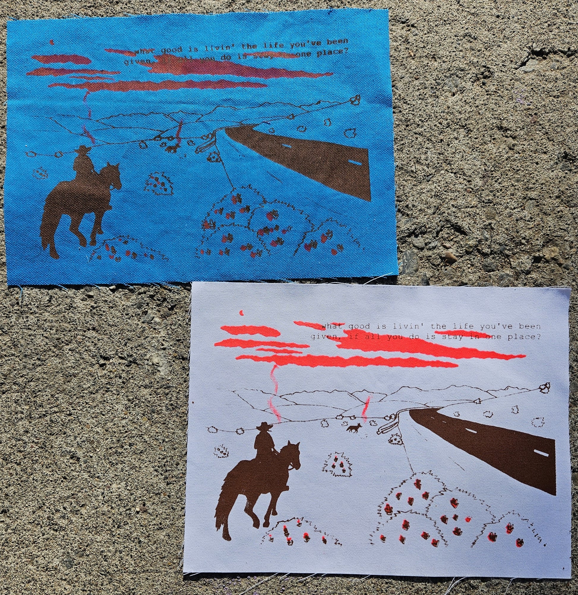 These patches featuring my Ends of the Earth illustration and the quote "what good is livin' the life you've been given, if all you do is stay in one place?" from the Lord Huron song "Ends of the Earth." They have been screen printed by hand in two colors, including a rainbow roll in blacklight reactive eco-friendly, high quality ink onto 100% cotton denim or canvas.