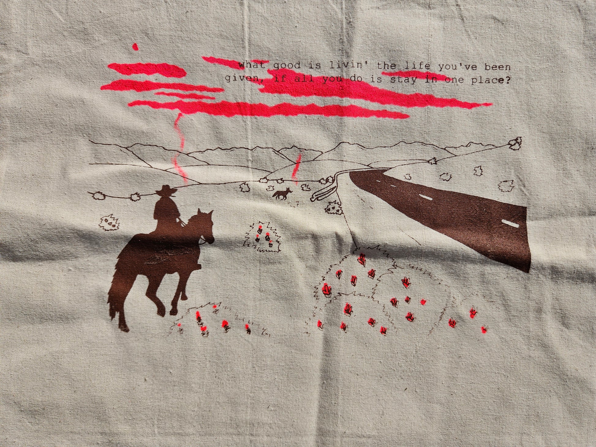 These are 100% cotton tote bags featuring my Ends of the Earth illustration and the quote "what good is livin' the life you've been given, if all you do is stay in one place?" from the Lord Huron song "Ends of the Earth." They have been screen printed by hand in two colors, including a rainbow roll in blacklight reactive eco-friendly, high quality ink.
