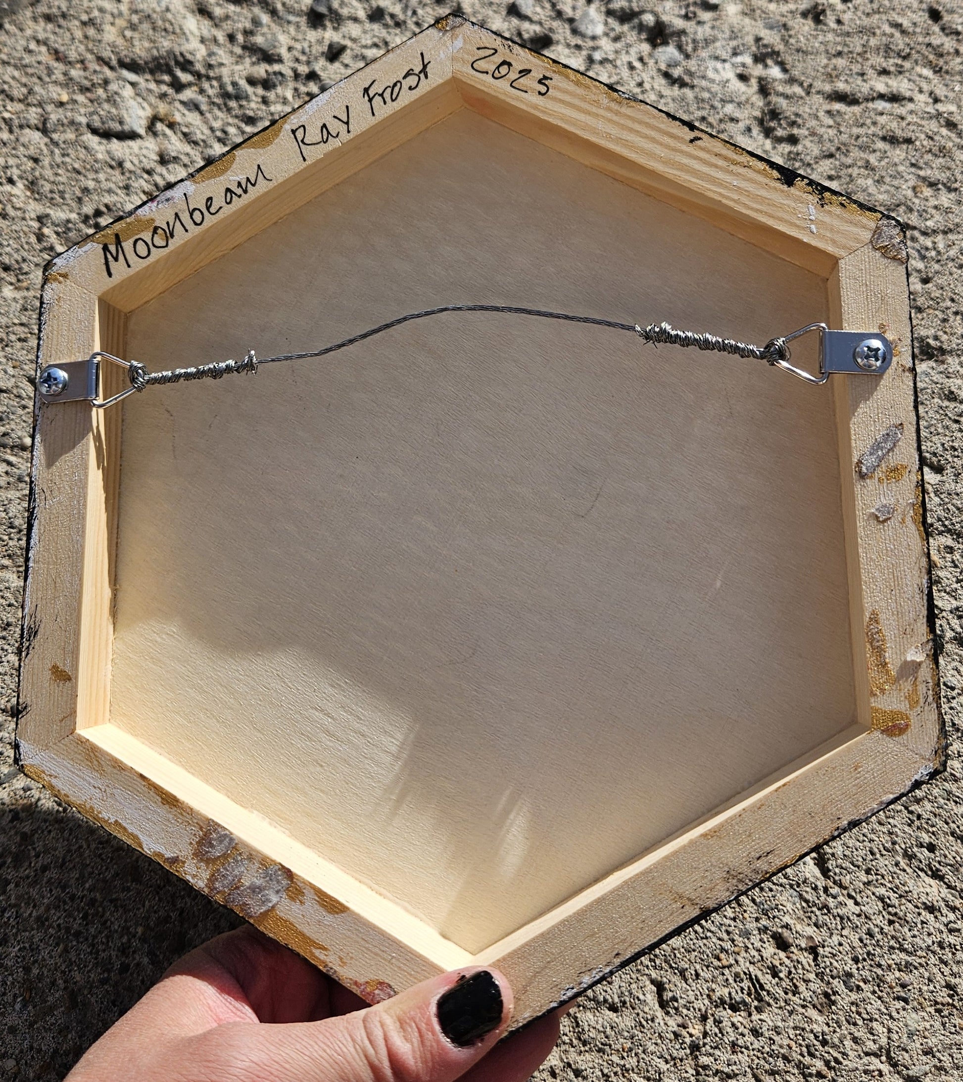 This is an original acrylic painting on a hexagonal wood panel. Features iridescent Lovetone duochrome accents in her hair and a white iridescent moon. It is sealed with a satin sealant spray. Comes wired and ready to hang. One corner features some minor damage, as pictured. Painted summer 2025, signed and dated.