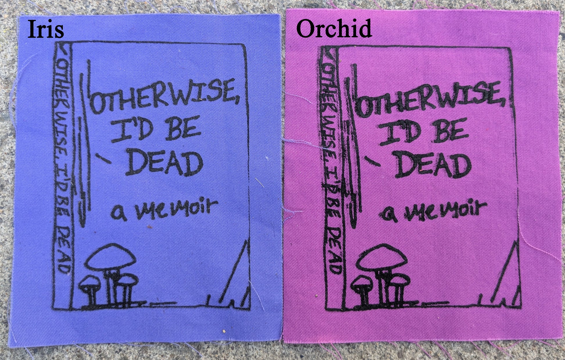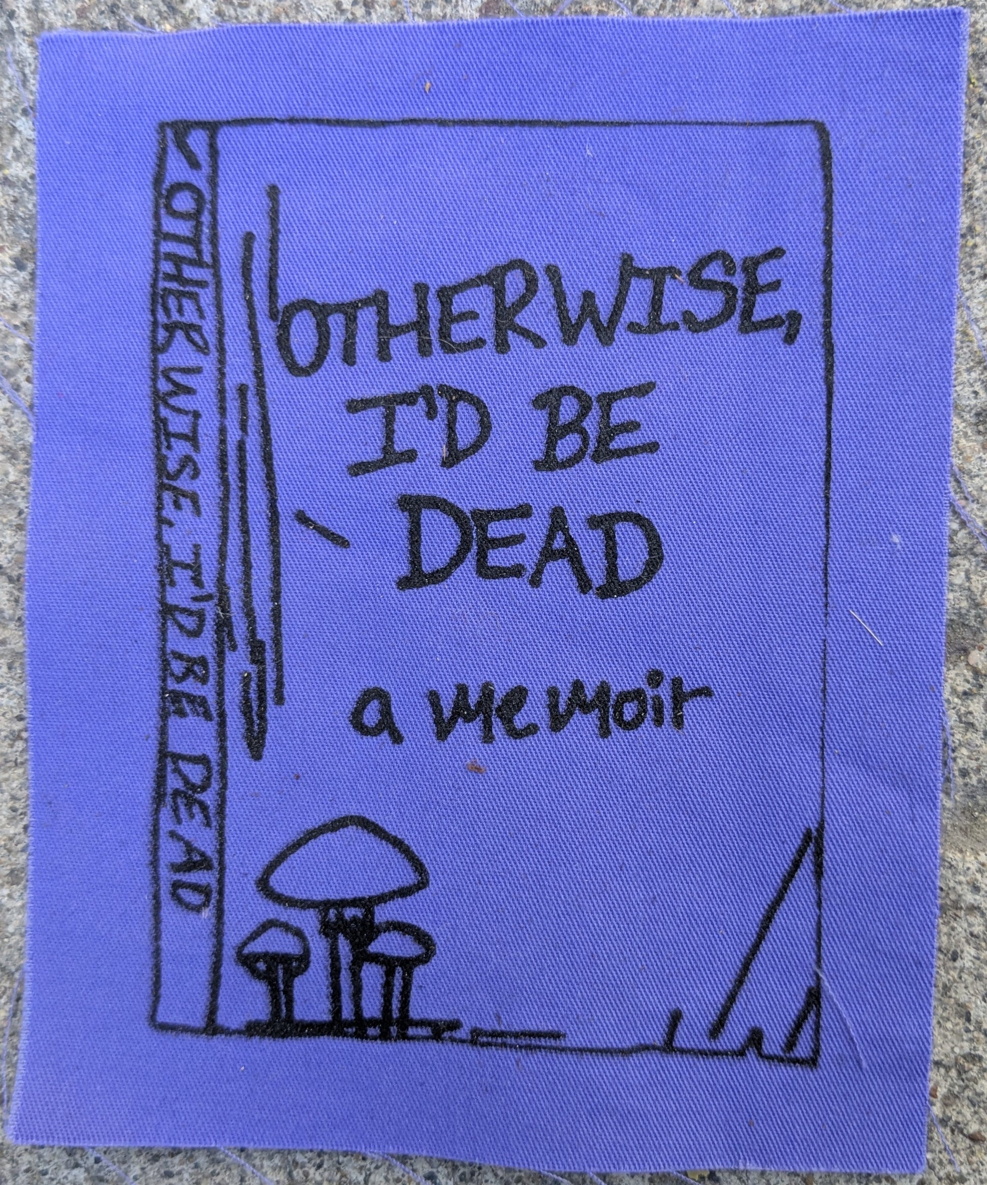 These are small punk patches which feature a hand drawn image of a book which reads "Otherwise I'd Be Dead: a memoir" with mushrooms on the cover. They have been screen printed by hand with eco-friendly, high quality black ink onto 100% cotton denim.